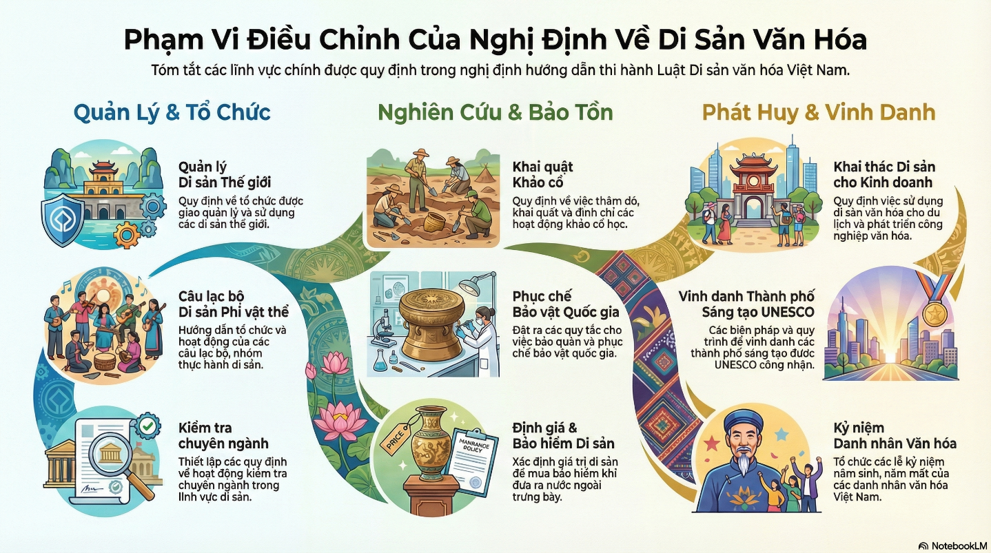 Theo đó, Nghị định quy định các biện pháp để tổ chức, hướng dẫn thi hành Luật Di sản văn hóa, cụ thể