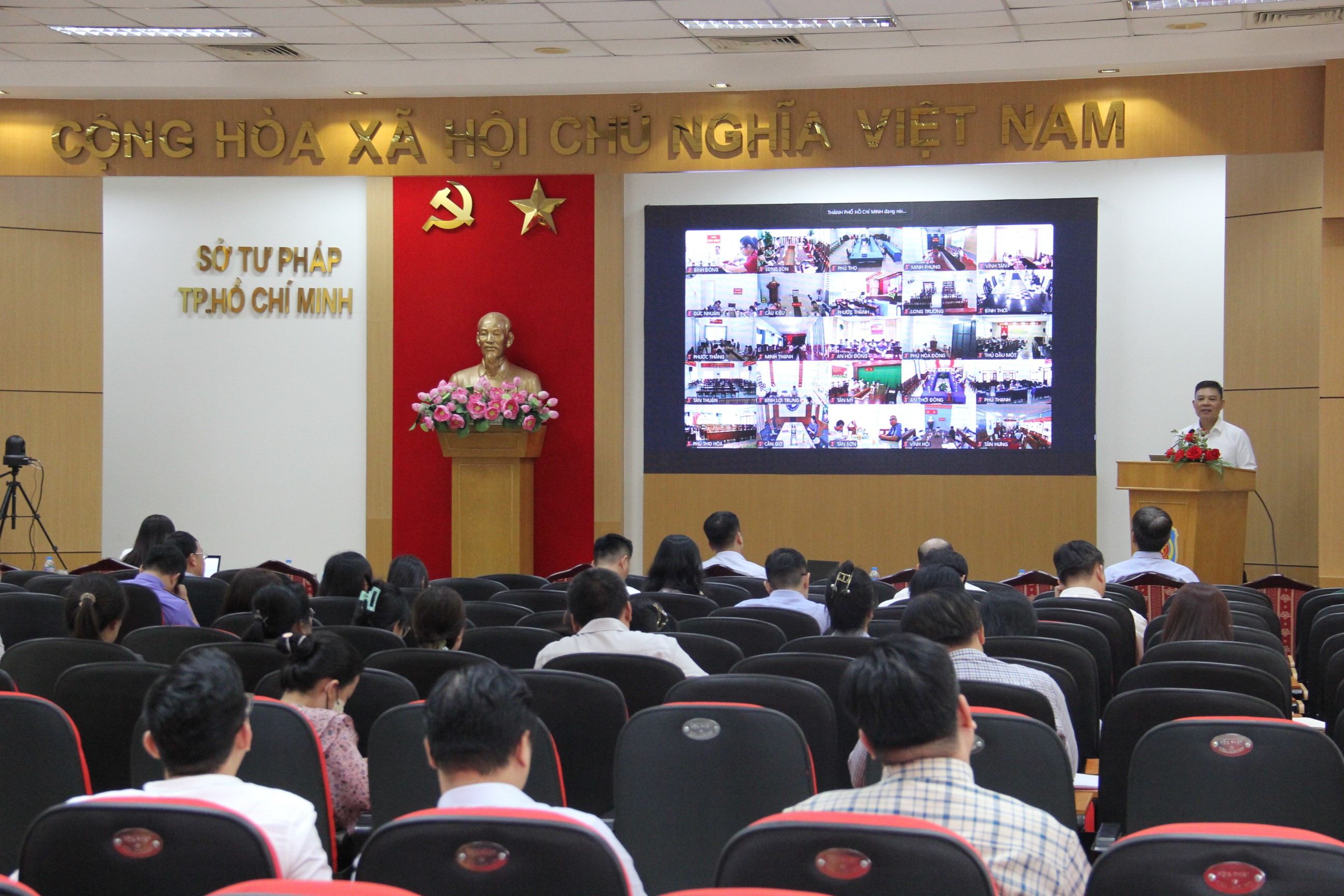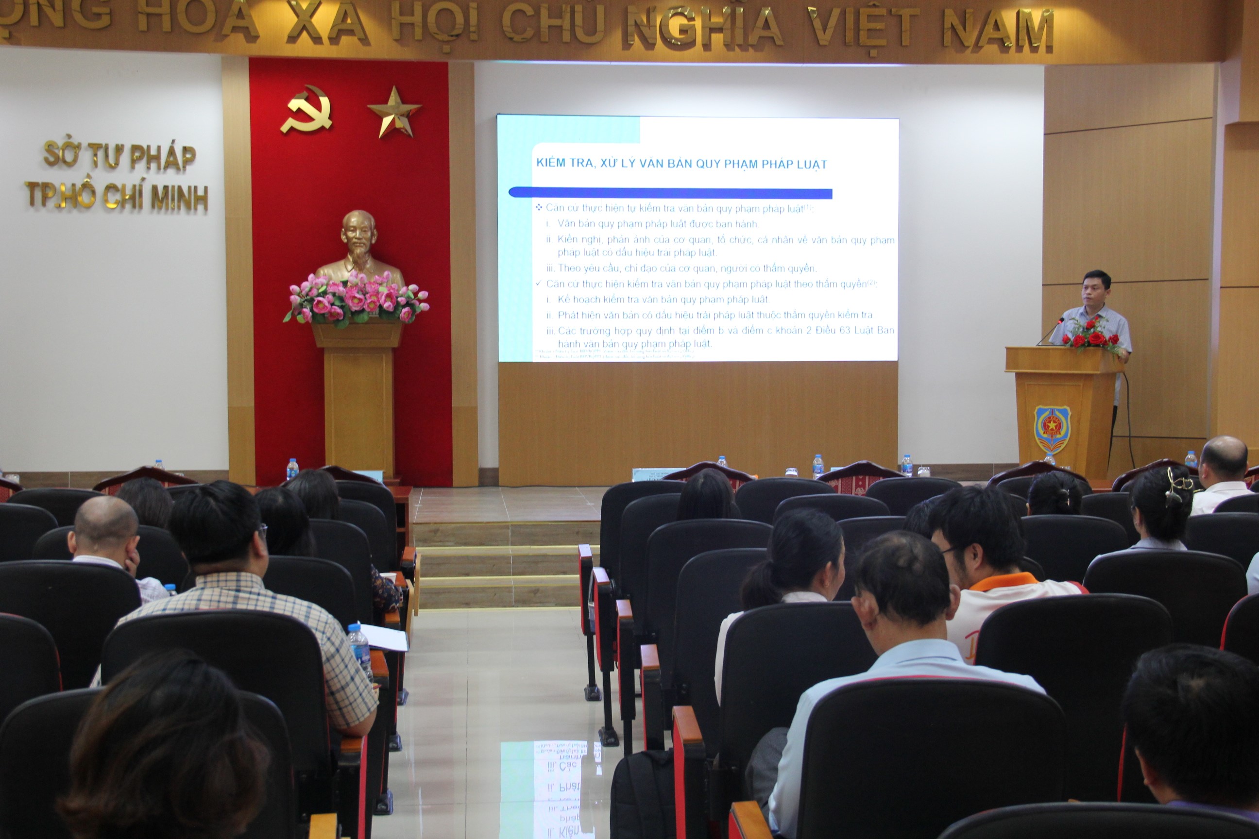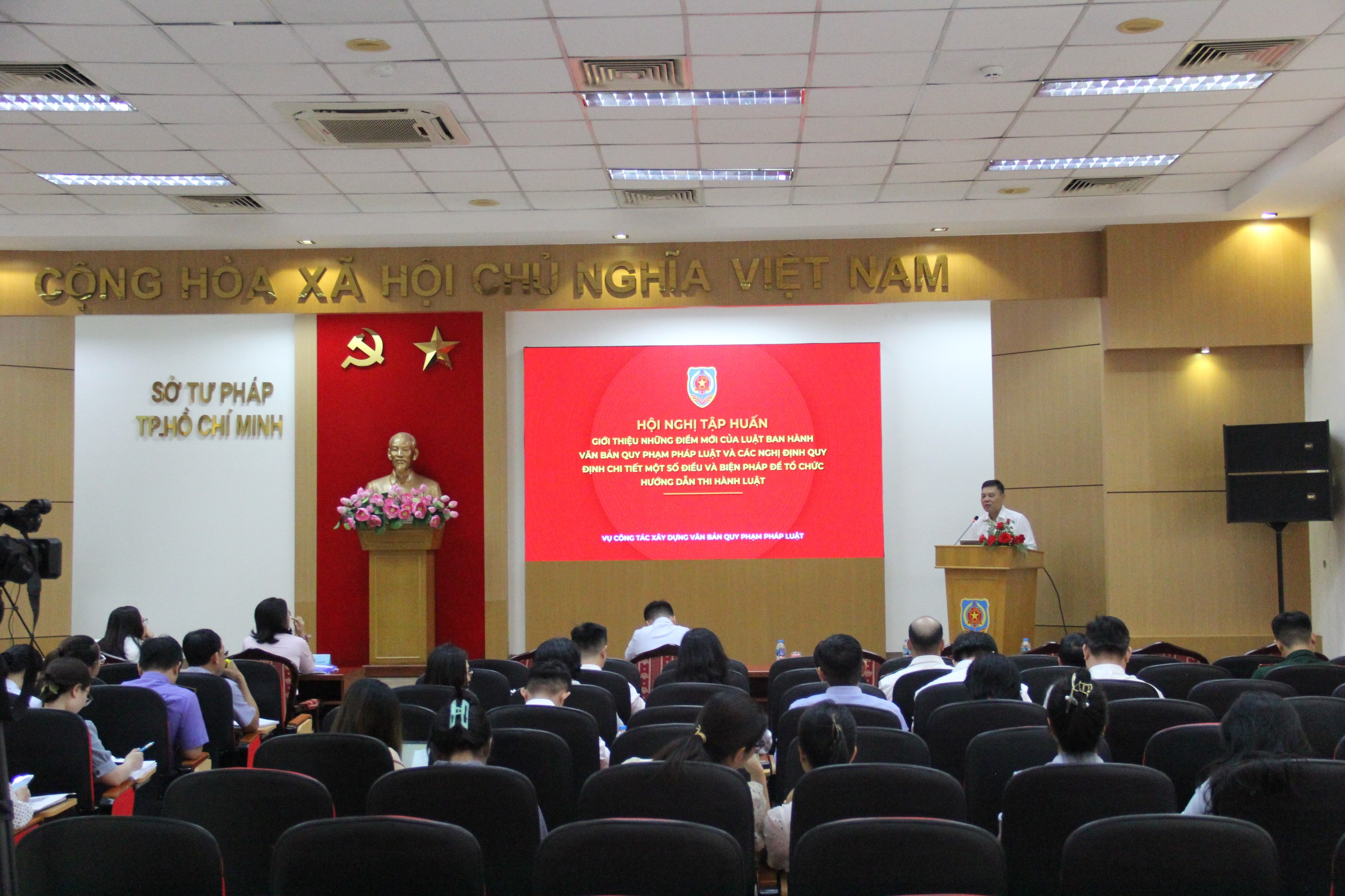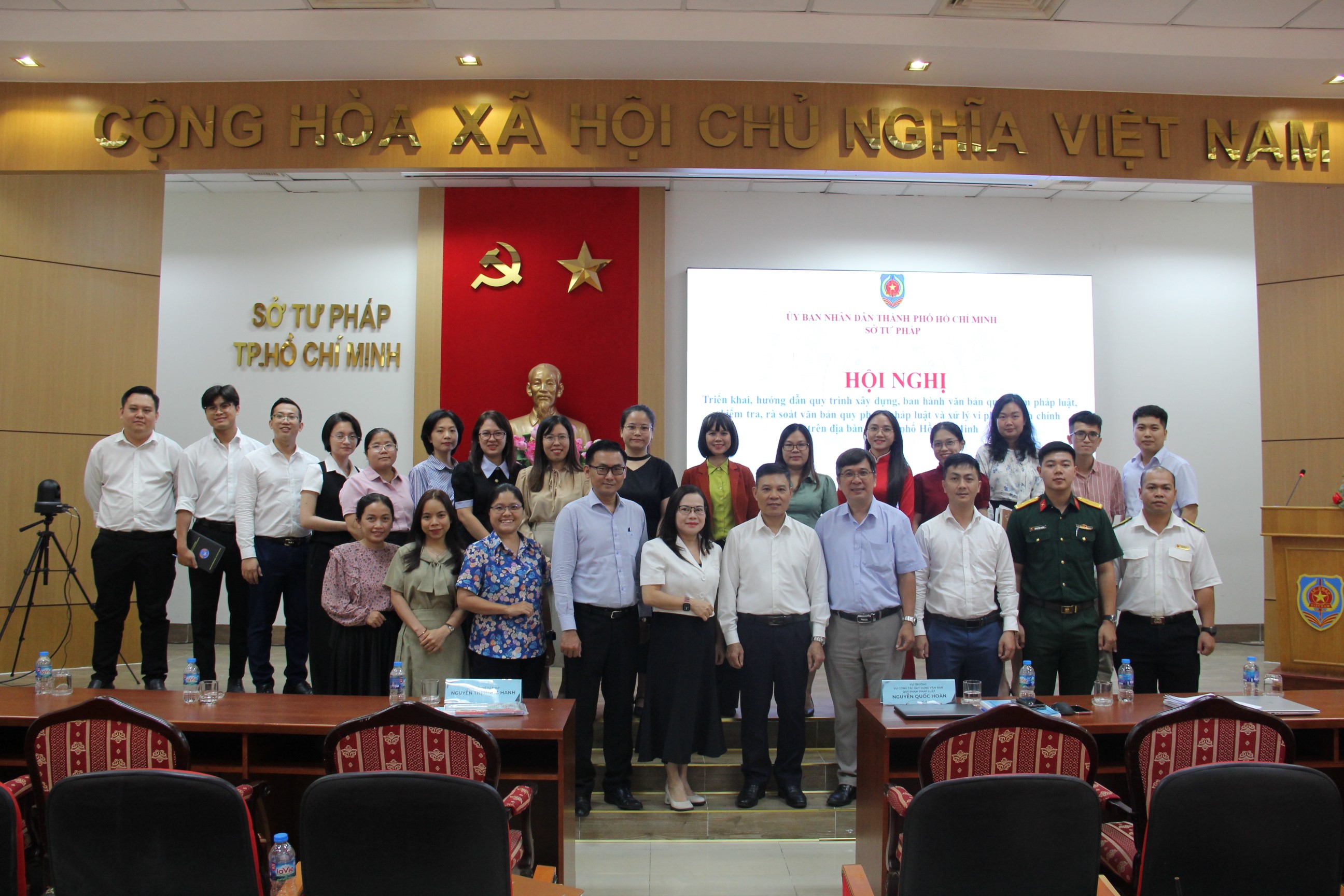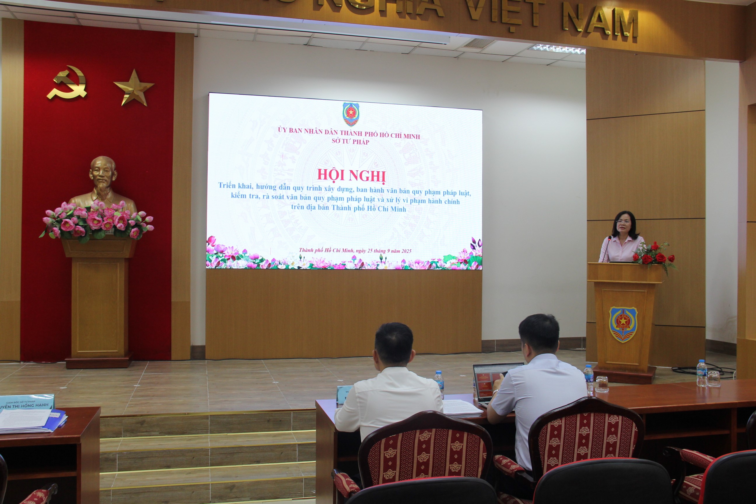 Trên cơ sở phân công của Ủy ban nhân dân Thành phố, ngày 25 tháng 9 vừa qua, Sở Tư Pháp Thành phố Hồ Chí Minh đã chủ trì tổ chức Hội nghị triển khai hướng dẫn quy trình xây dựng ban hành văn bản quy phạm pháp luật, kiểm tra rà soát văn bản quy phạm pháp luật và xử lý vi phạm hành chính trên địa bàn Thành phố Hồ Chí Minh với gần 100 đại biểu tham dự trực tiếp là đại diện Ủy ban Mặt trận Tổ quốc Việt Nam Thành phố, các Ban của Hội đồng nhân dân Thành phố, Văn phòng Đoàn Đại biểu Quốc hội - Hội đồng nhân dân Thành phố và các Sở, ban ngành Thành phố. Song song đó, Hội nghị kết nối trực tuyến với 168 điểm cầu là Ủy ban nhân dân các phường, xã, đặc khu của Thành phố Hồ Chí Minh.