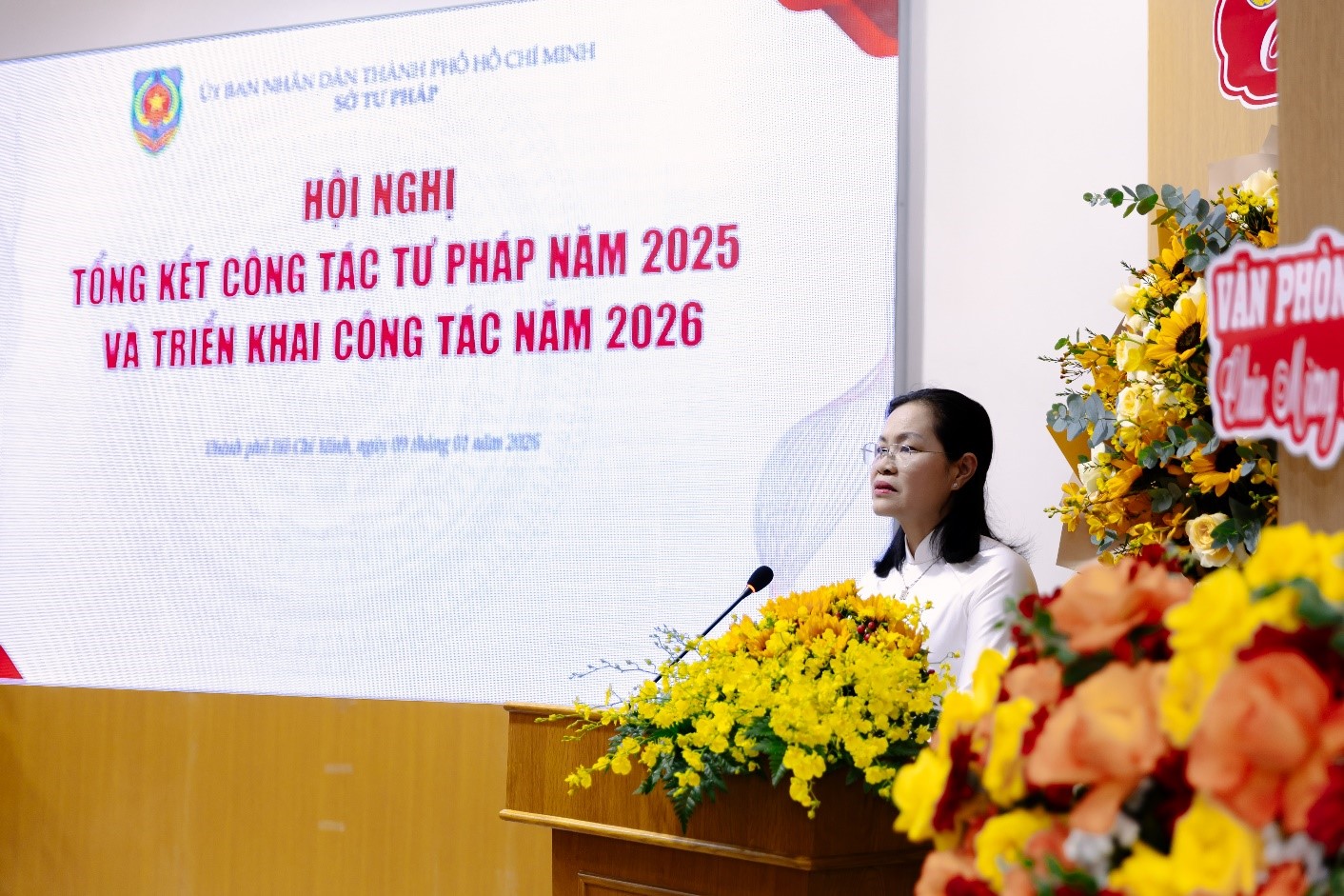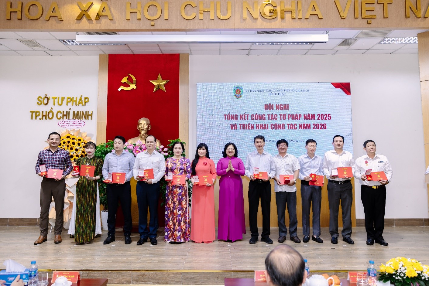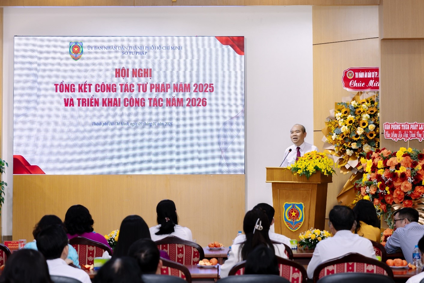 Ngày 09/01/2026, Sở Tư pháp Thành phố Hồ Chí Minh tổ chức hội nghị tổng kết công tác tư pháp năm 2025 và triển khai công tác năm 2026. Tham dự Hội nghị có đồng chí Mai Lương Khôi- Ủy viên Ban Thường vụ Đảng ủy Bộ Tư pháp/Thứ trưởng Bộ Tư pháp; đồng chí Nguyễn Trường Nhật Phượng, Thành ủy viên/Phó Chủ tịch Hội đồng nhân dân Thành phố; đồng chí Trần Văn Bảy, Thành ủy viên/Phó Chủ tịch Ủy ban nhân dân Thành phố; lãnh đạo Văn phòng Bộ Tư pháp, các đồng chí lãnh đạo các sở, ban, ngành Thành ủy, UBND thành phố; nguyên lãnh đạo Sở Tư pháp (Sở Tư pháp Thành phố Hồ Chí Minh (cũ), Sở Tư pháp tỉnh Bình Dương (cũ), Sở Tư pháp tỉnh Bà Rịa-Vũng Tàu (cũ)) các thời kỳ; lãnh đạo UBND một số phường, xã trên địa bàn Thành phố Hồ Chí Minh; lãnh đạo các phòng chuyên môn và đơn vị trực thuộc Sở; đại diện các tổ chức bổ trợ tư pháp trên địa bàn Thành phố và các tập thể, cá nhân nhận khen thưởng.